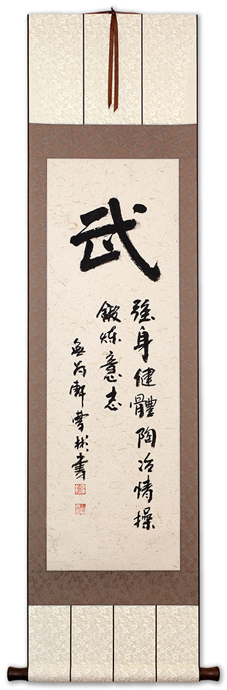 Below this martial character is an inscription that reads, "强身健体 陶冶情操 锻炼意志". This means, "Strengthen your body, relax your mind, train your spirit".