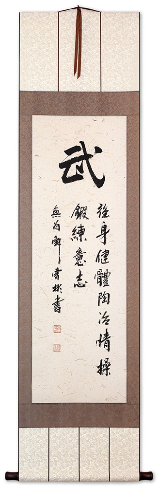 Below this martial character is an inscription that reads, "强身健体 陶冶情操 锻炼意志". This means, "Strengthen your body, relax your mind, train your spirit".
