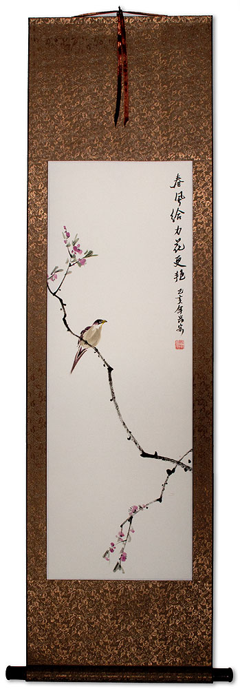 Close up view of the bird artwork mounted to this silk brocade wall scroll