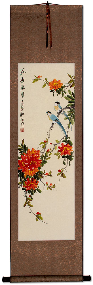 This beautiful wall scroll features two blue birds alighting on a branch of gorgeous flowers.
