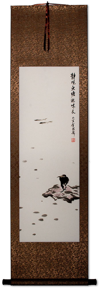 Close up view of the bird artwork mounted to this silk brocade wall scroll