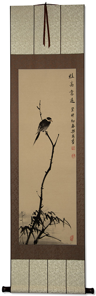 The title is 枝高意遠 which translates as "High branches, far-reaching." This has a further meaning of a high branch making the atmosphere of the earth seem higher, and possibilities endless.