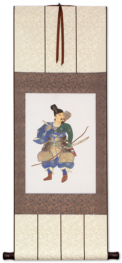 Close up view of the warrior artwork mounted to this silk brocade wall scroll