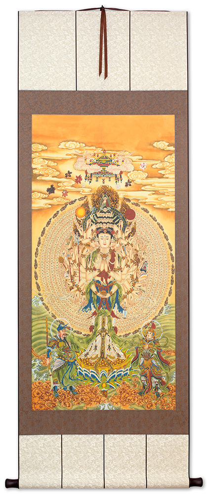 I can print this larger, on the paper texture of your choice, and give you whatever silk brocade colors you want. Ready-to-frame prints can be delivered in a few days. However, it does take several weeks for custom wall scrolls. Either way, it's worth the wait if you want something really custom and unique.