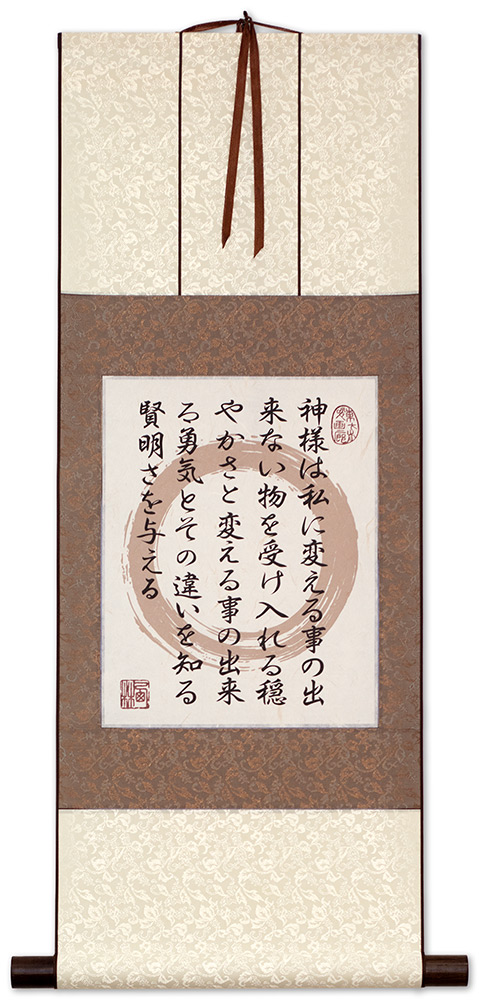 I can print this larger, on the paper texture of your choice, and give you whatever silk brocade colors you want. Ready-to-frame prints can be delivered in a few days. However, it does take several weeks for custom wall scrolls. Either way, it's worth the wait if you want something really custom and unique.