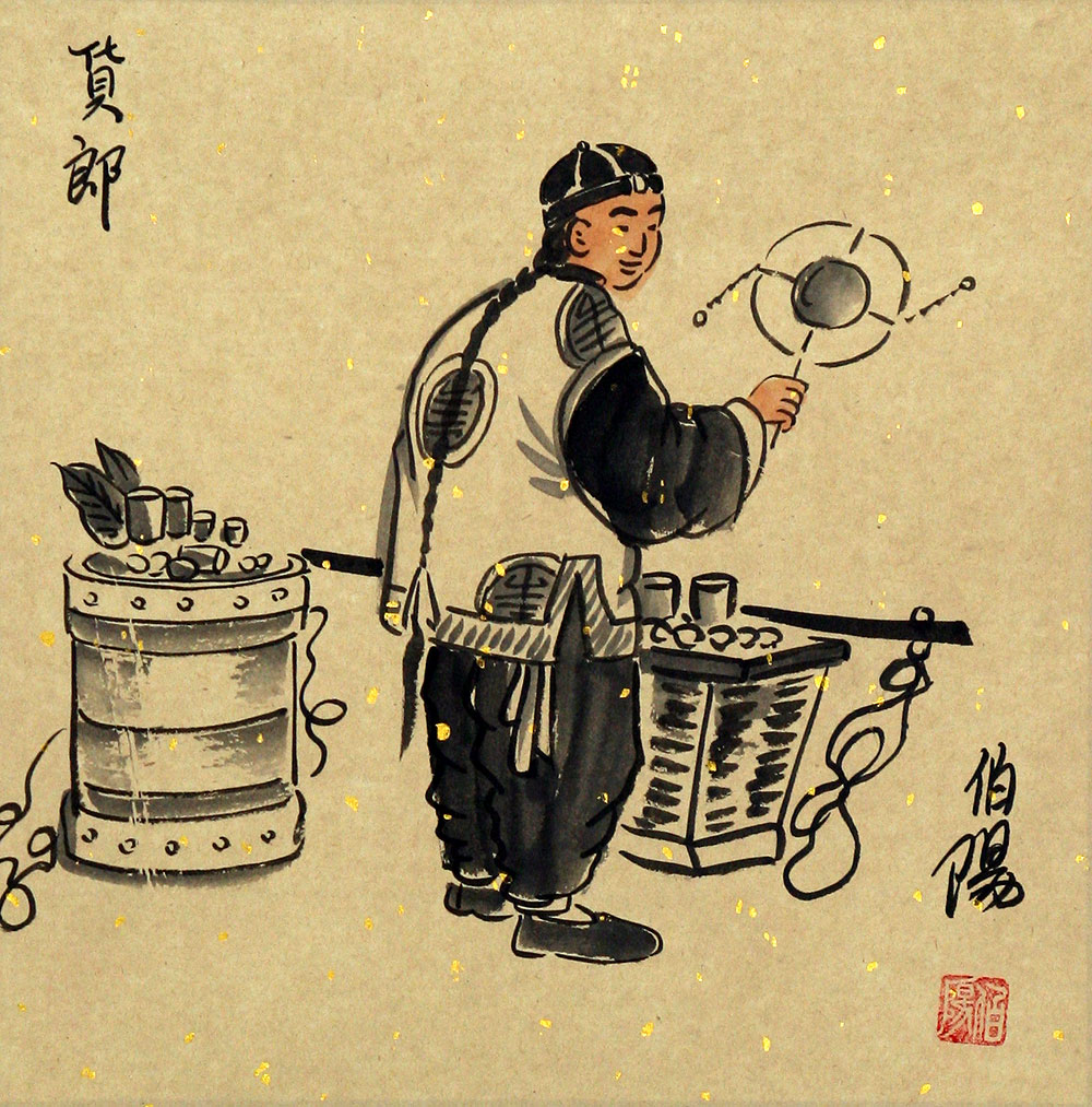 He was born in 1957 and grew up in Hebei province (the area that surrounds the special capital district of Beijing / Peking). You can find his artwork for sale at various art markets and galleries around Beijing. All the old Beijingers recognize these classic scenes of traditional life. Modern times have caused some of the practices depicted in Bo Yang's paintings to virtually disappear. But, his paintings help the idea of this traditional Beijing lifestyle to live on.