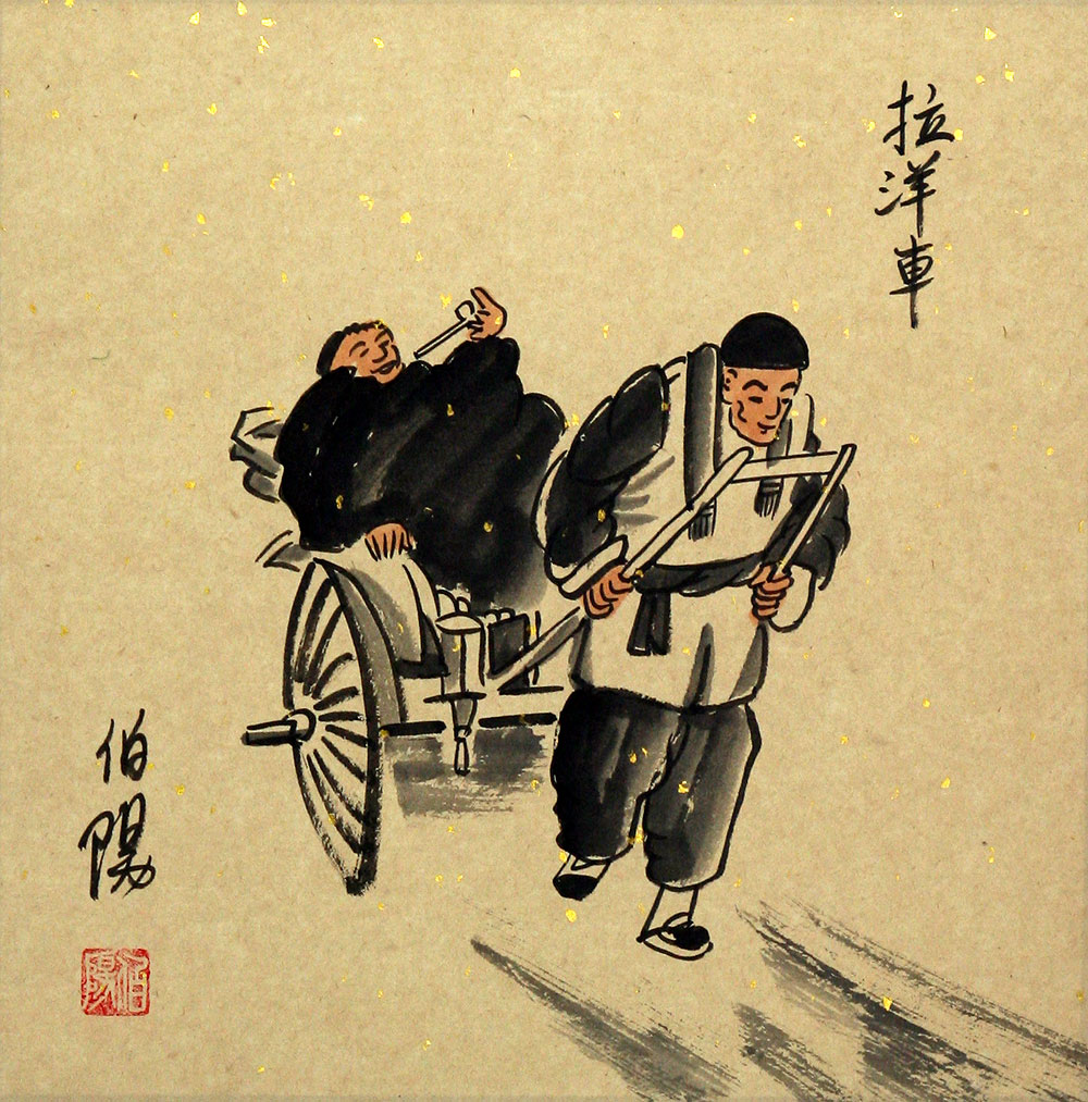 The title written on this painting is "lā yáng jū" or "拉洋車", which means "Rickshaw Puller".