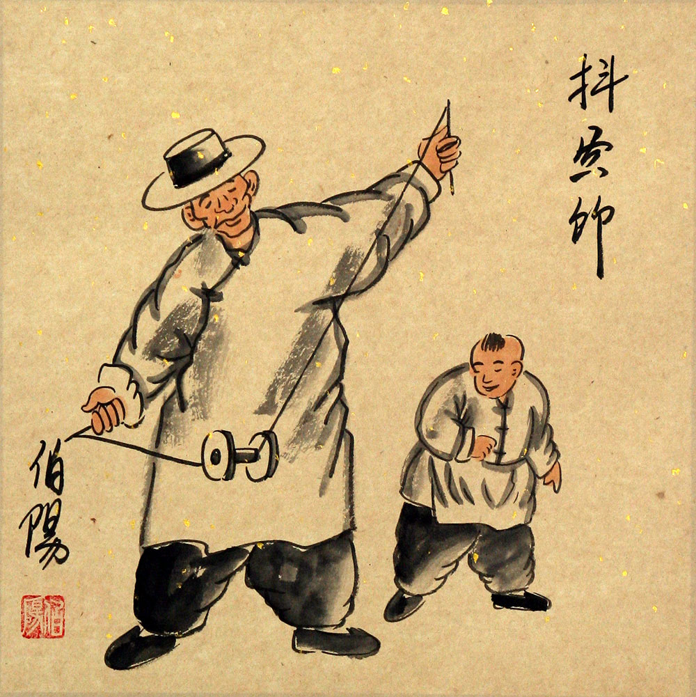 This painting features a man demonstrating a Chinese yo-yo or diabolo in old Beijing during the Qing Dynasty. This twirling spool of bamboo makes a delightful whistling sound as it spins round and round. This toy dates back .