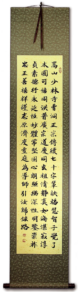 This calligraphy includes the title and poem that celebrates the tactics and virtues of the Shaolin Kung Fu Monks for future generations.