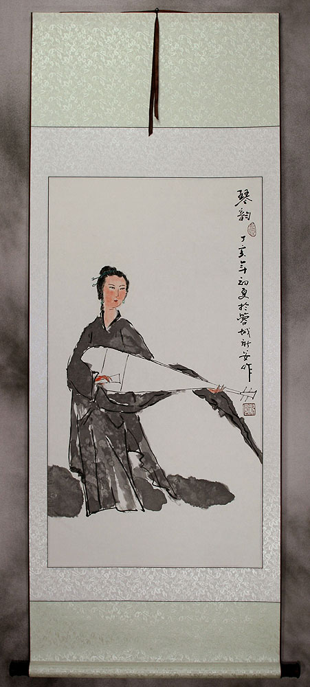Close up view of the Asian woman artwork mounted to this silk brocade wall scroll