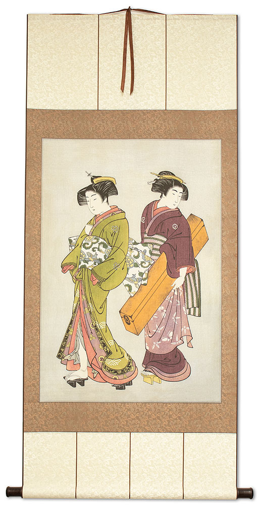 This depicts a geisha walking through town followed by a servant carrying a box. Both of them have their hair styled in the torobin fashion, a hairstyle popular during the end of the An’ei era. The Japanese title suggests there is a 三味線 (a 3-stringed lute called a Shamisen or Samisen) in the box the servant is carrying. They may be on the way to do a performance somewhere, or perhaps they just returned from shopping for and purchasing this special musical instrument.