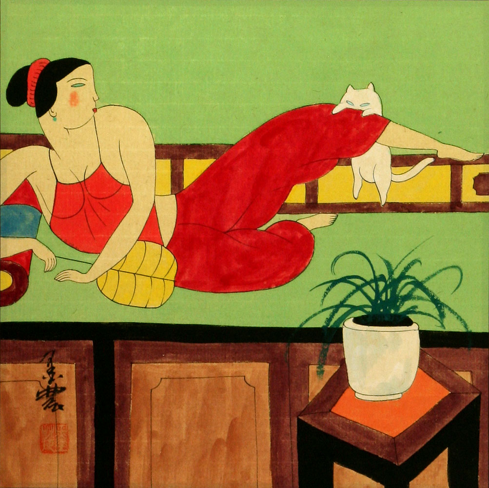 Information about how this Asian painting is mountedA serene, slightly stylized scene. A woman lounges gracefully across a traditional platform bed. She wears loose red trousers and a red sleeveless top — the vibrant red of her clothing stands out boldly against a muted green background. Her pose is relaxed yet composed: one arm supports her upper body, while her legs are draped casually, one foot resting on the bench and the other stretched out sideways.