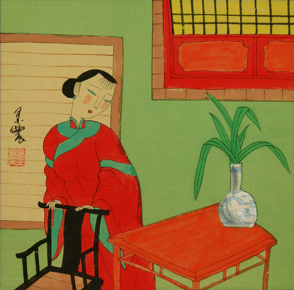 Information about how this Asian painting is mountedThis painting features a Chinese woman in a warm coat with a mandarin collar, glancing at her vase of green leaves.