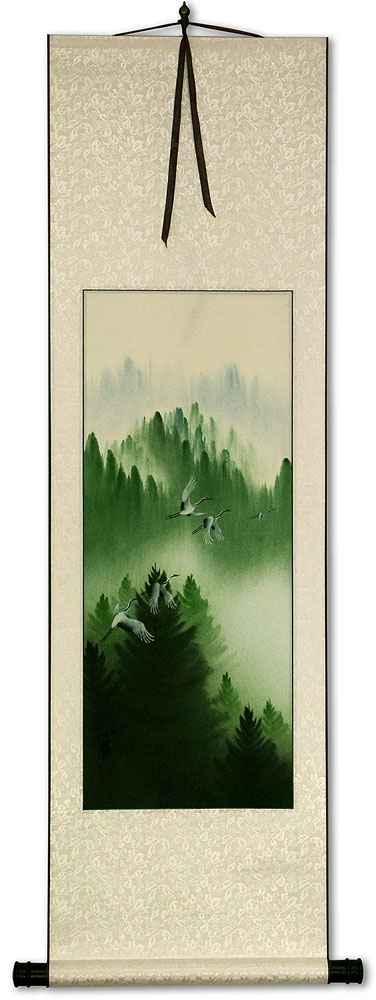 This wall scroll depicts cranes as they emerge from the green forest and make their way across the sky in the Spring.