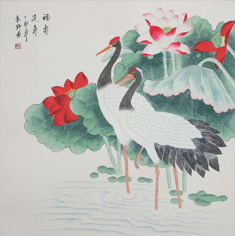 The Chinese title is 福壽延年 or "fú shòu yán nián" which translates as, "May You Enjoy Good Fortune and Longevity".